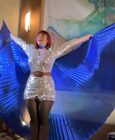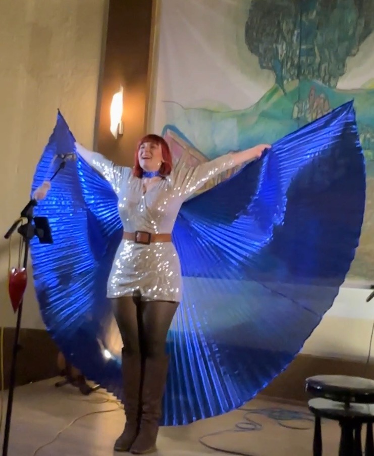 Besonders eindrucksvoll wurde es, als Flickentanz bei der Zugabe mit ihren blauen Flügeln auf die Bühne zurückkehrte – ein Bild voller Poesie und Leuchten. Doch damit nicht genug: Zusätzlich brachte sie noch die roten Flügel ins Spiel, die in ihren Konzerten für Mut, Ausdruckskraft und Verspieltheit stehen. Und mit genau diesen roten Flügeln nahm der Abend eine unvergleichlich humorvolle Wendung.