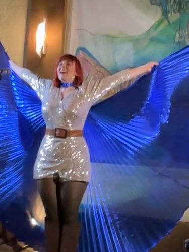 Mit einem verschmitzten Lächeln richtete Daniela Flickentanz sich an Frank L. Richter und lud ihn ein, die roten Flügel einmal selbst auszuprobieren. Ein Moment, der irgendwo zwischen Scherz, Neugier und Bühnenzauber schwebte. Und Richter? Er zögerte nicht lange.