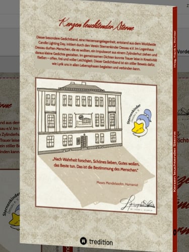 Besondere Freude bereitet Richter die Unterstützung von Frau Eter Hachmann, Politikwissenschaftlerin und Dezernentin für Soziales, Bildung, Jugend und Senioren der Stadt Dessau-Roßlau: Mit ihren warmherzigen Einschub im Vorwort würdigt sie die Überraschung und betont den Wert des Engagements des Vereins Sternenkinder Dessau e.V. Ebenso steuerte der Philosoph und Lyriker Stephan Mörs spontan, anlassbezogen, ein "Elfchen" bei.