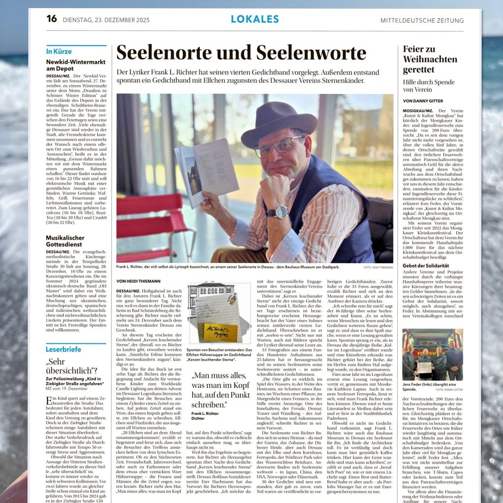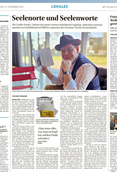 Dabei ließ Frank L. Richter Impulsworte aus einem Hut ziehen und animierte die anwesenden Menschen, kurze Gedichte in Form von Elfchen oder Haiku zu verfassen. Die so entstandenen Kurzgedichte sammelte und veröffentlichte Richter anschließend als Herausgeber – bewusst als Geschenk für den Verein Sternenkinder Dessau e.V., getragen von Gemeinschaft, Erinnerung und Licht.