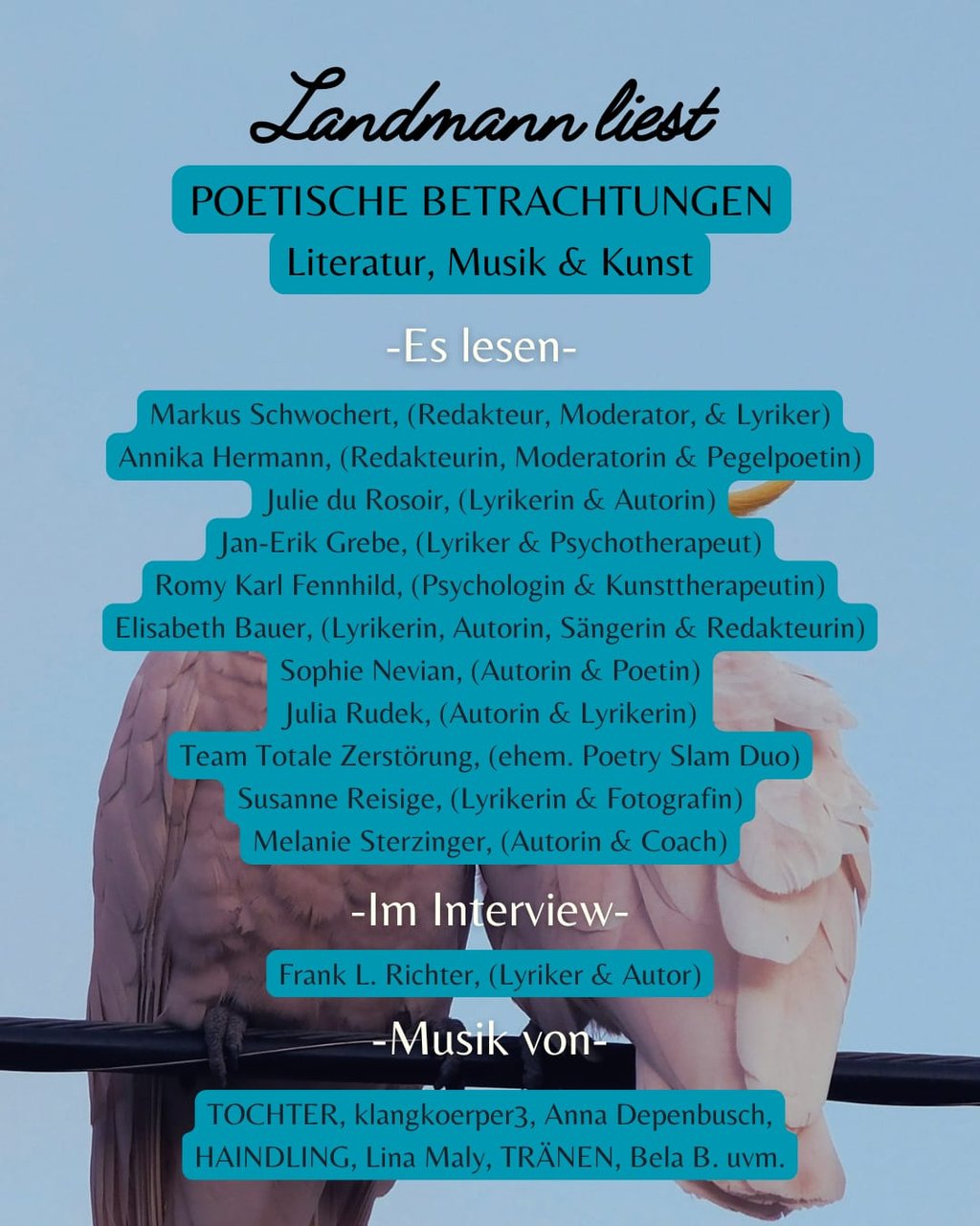In der Aprilausgabe der Radiosendung "Poetische Betrachtungen" bei Landmann liest auf rockradio.de wird Frank L. Richter von Annika Hermann zu seinem neuesten Gedichtband "Lyrisophie - Kleines Alphabet des L(i)ebens pt.1-pt.3" interviewt. Nach der Ausstrahlung wird die Sendung auch auf YouTube zur Verfügung gestellt. Der Link folgt.