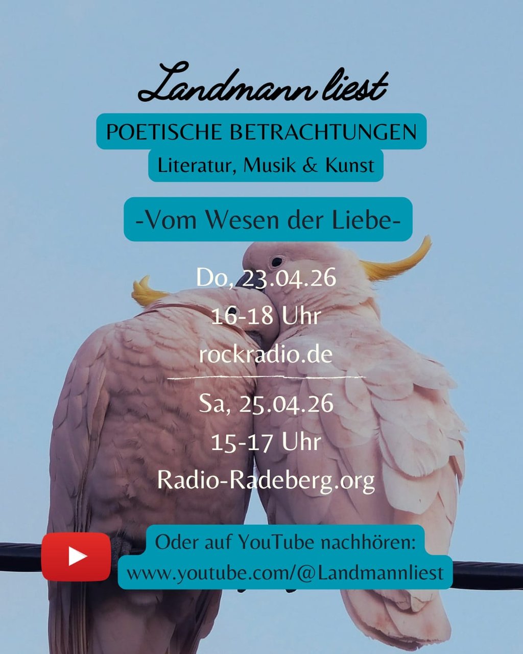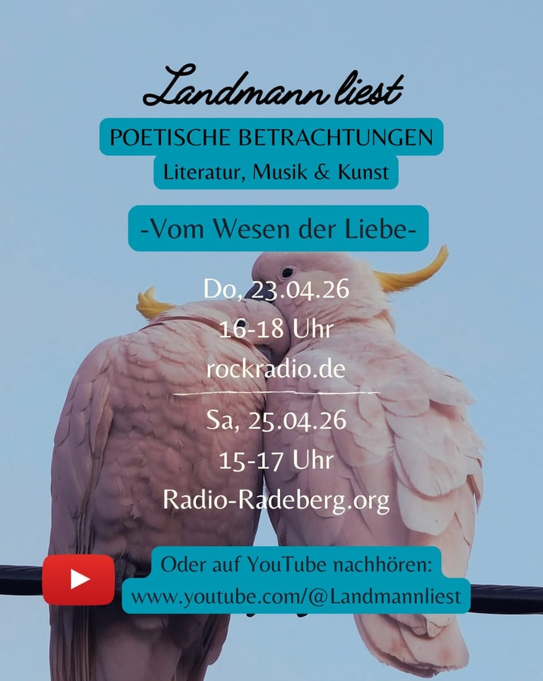 In der Aprilausgabe der Radiosendung "Poetische Betrachtungen" bei Landmann liest auf rockradio.de wird Frank L. Richter von der wunderbaren Annika Hermann zu seinem neuesten Gedichtband "Lyrisophie - Kleines Alphabet des L(i)ebens pt.1-pt.3" -passend zum Thema der Sendung "vom Wesen der Liebe"- interviewt. Nach der Ausstrahlung wird die Sendung auch auf YouTube zum Nachhören zur Verfügung gestellt. Der Link folgt.